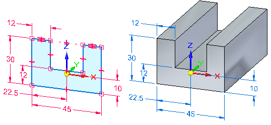 You can add dimensions and geometric relationships to control the size, shape, and position of the sketch elements. You can also place dimensions and geometric relationships relative to the primary axes of the coordinate system. This can be especially useful for symmetric parts during later design modifications. For example, the 10 mm and 22.5 mm dimensions were placed relative to the X and Z axes of the base coordinate system.