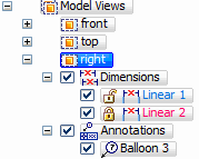 All dimensions, annotations, view settings, and section views that are displayed when you create the model view are copied to the model view.
