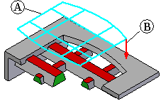 Draft angle for a vent feature is defined relative to the sketch and extent direction for the feature. For the following vent feature, the sketch (A) is positioned above the part, and the extent (B) is defined downward toward the part. The red faces on the ribs and spars are then considered outside faces, and the draft direction was defined as outward, which adds material.