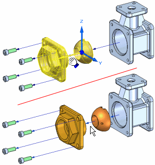 To move a part and all its dependent parts: set the Move Dependent Parts option on the command bar, then select the part you want to move. The part and all its dependent parts highlight. When you click the Accept button, an orientation triad is displayed. By default, the original explode vector axis is selected. Drag the cursor to move the set of parts to the new location.