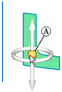 2. Position the cursor over the sketch element (A) or model edge which you want to use as the axis of revolution. The handle switches to a revolve handle.