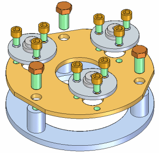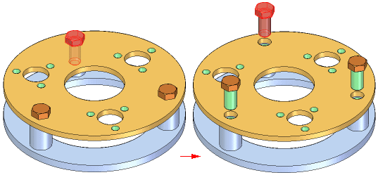 If you change the design of the part containing the feature pattern, the part pattern in the assembly updates. For example, if you increase the number of holes in the feature pattern, additional bolts are added to the part pattern in the assembly.