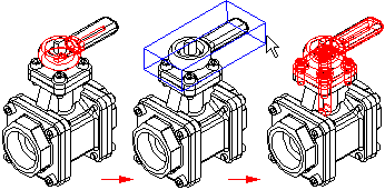 You can also use the Select Tool menu and the cursor to create a 3D selection box around a selected part to define a set of parts adjacent to the selected part. To create a 3D selection box, first click a single part to select it, then right-click the Selection Manager symbol