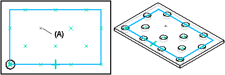 When you draw the rectangular pattern profile, the first point you click becomes the default reference point. The reference point is shown as a bold x symbol (B). Regardless of where you draw the pattern profile, the feature pattern is constructed relative to the reference point and the parent feature. For example, when patterning hole A, using reference point B, the pattern is constructed as shown.