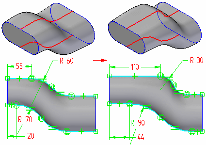 End cross sections defined using part edges, construction curves, and construction surfaces support a curvature continuous condition. A variable is added to the Variable Table, which you can edit to control the shape of the lofted feature. With lofts constructed using the BlueSurf command, you can also adjust the surface shape using a graphic handle.